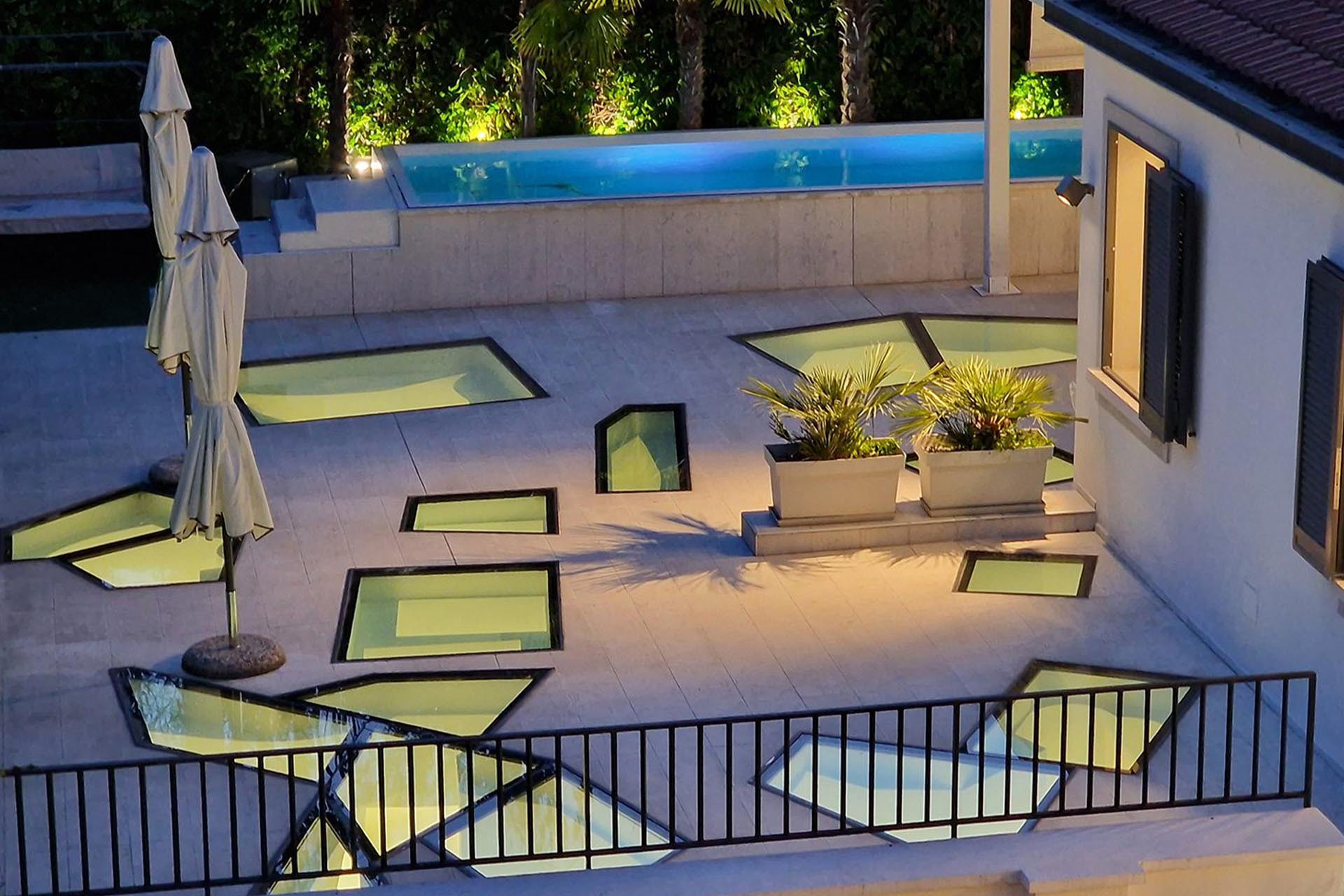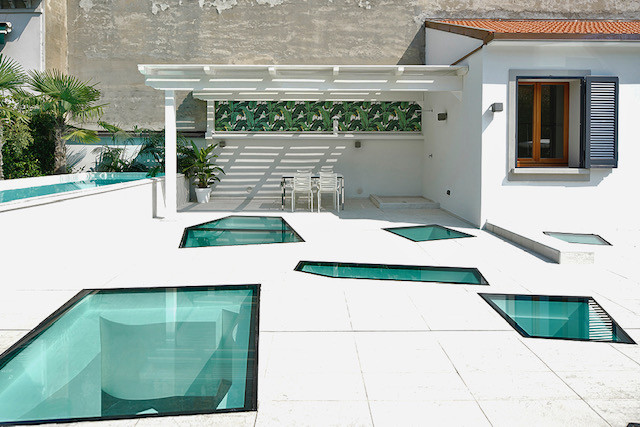 Open space di 800 mq distribuiti su tre livelli, dominato da un’estetica total white e da lucernari tridimensionali che danno un senso di luce e leggerezza ovunque. Attraverso una corte interna si accede all’ambiente principale, mentre al livello seminterrato è presente una zona adatta a catering o come deposito. Al secondo piano si apre un ampio terrazzo con arredi esterni e piscina, perfetto per eventi all’aperto. Grazie alla sua versatilità, è ideale per press day, presentazioni, eventi aziendali e privati, offrendo atmosfere moderne, minimaliste e scenografiche.