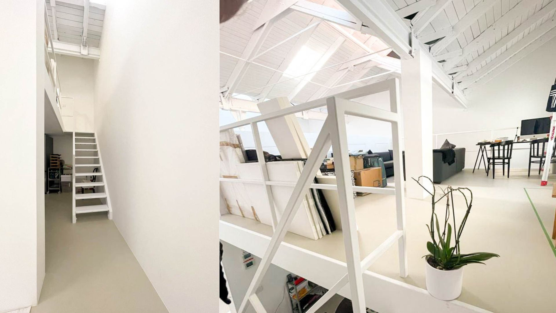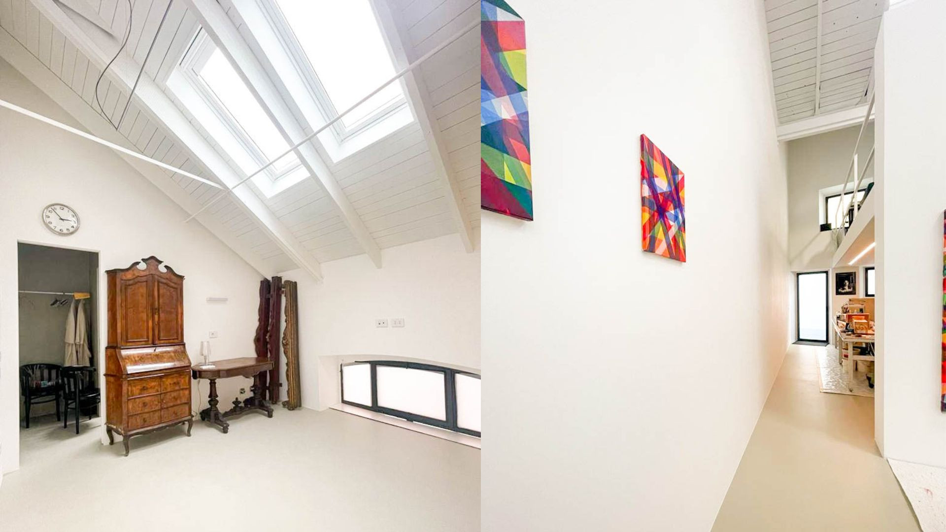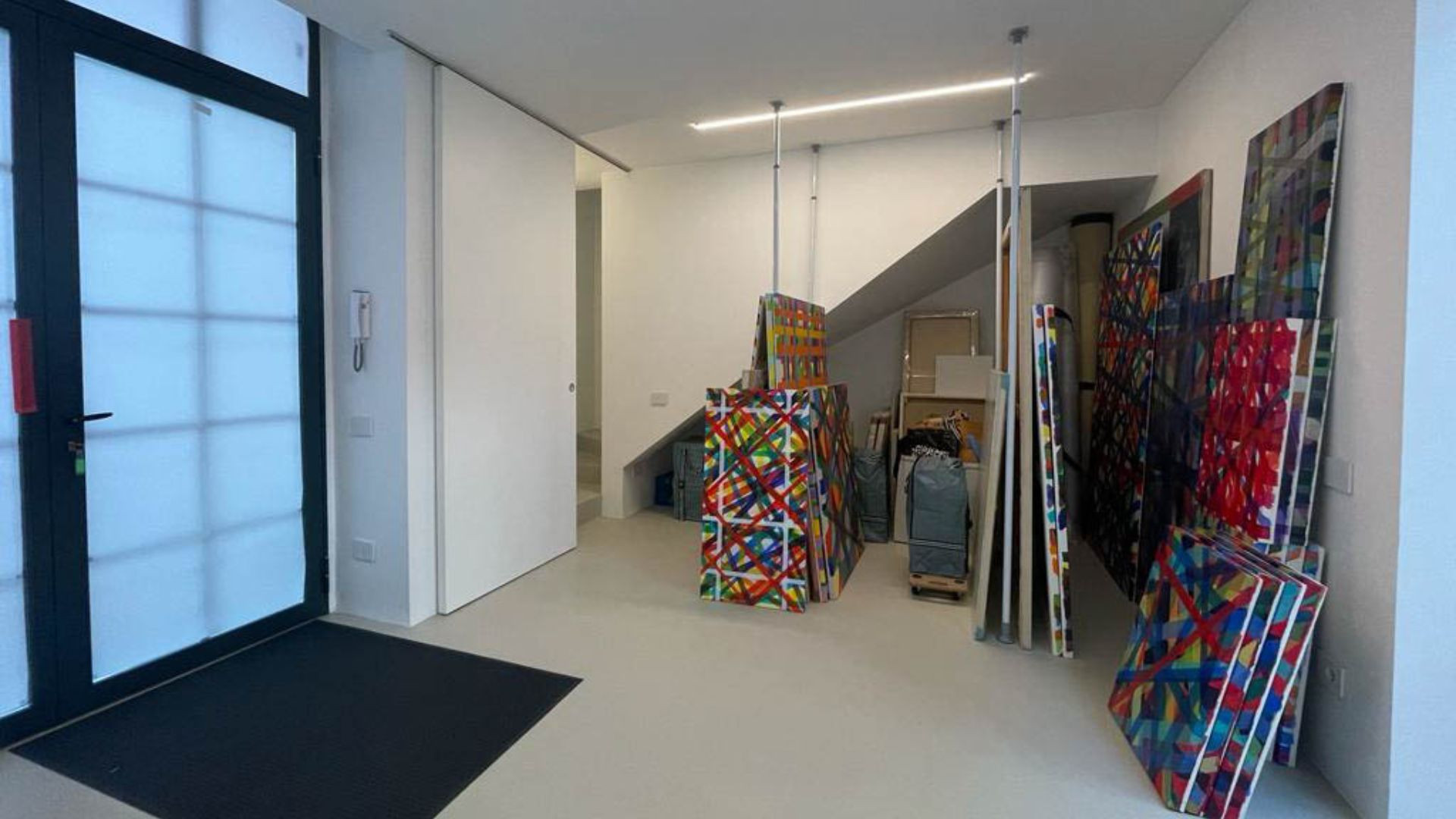 Lo spazio è il loft/laboratorio di un artista. Situato in un cortile vecchia Milano. Si compone di un ampio ingresso con annesso bagno. Nello spazio principale ampie pareti bianche e travi a vista, illuminato da grandi lucernari. Crea la cornice ideale per un percorso espositivo che si sviluppa tra il piano principale e un soppalco panoramico, offrendo prospettive uniche e coinvolgenti.